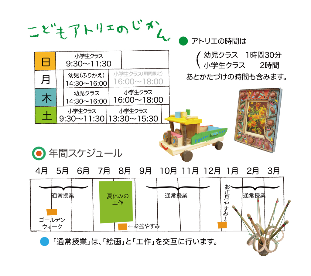 基本的に画材や工作材料は教室で準備しますので、特に画材等を購入していただく必要はありません(例外がある場合もあります)。ただし、「夏の工作」については、別途材料代をいただいています。